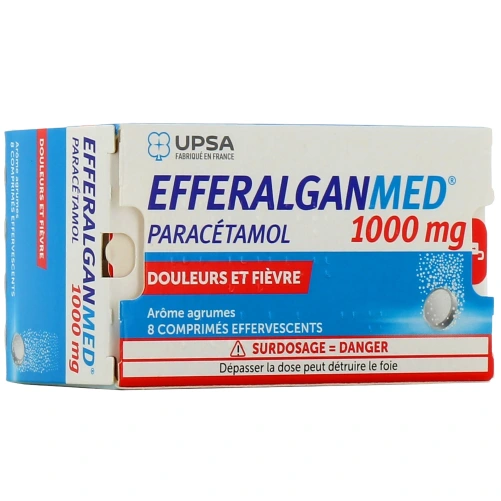 EfferalganMed 1000 mg est un médicament anti douleur indiqué chez l’ individu de plus de 50 kg en cas de fièvre ou de douleurs (maux de tête, mal de dent, courbatures, règles etc.) dESCRIPTIONS EFFERALGAN 1000 MG EfferalganMed 1000 mg s’utilise pour le traitement symptomatique des douleurs légères à modérées et/ou de la fièvre. Ce médicament convient aux adultes et aux enfants à partir de 50 kg (environ 15 ans). Il se présente en tube de 8 comprimés effervescents, goût agrumes. Posologie et Mode d’administration Posologie Attention : chaque comprimé contient 1 000 mg (1 g) de paracétamol. Ne pas prendre deux comprimés à la fois. Utiliser la dose minimale efficace sur une durée la plus courte possible. En cas de douleurs ou fièvre non soulagées par 500 mg de paracétamol, prendre 1 000 mg. La posologie recommandée est d’environ 60 mg/kg/jour, répartie en plusieurs prises, sans dépasser la dose maximale indiquée ci-dessous : Poids (Âge approximatif) Dose maximale par prise Intervalle d’administration Dose journalière maximale Adulte et enfant à partir de 50 kg (environ 15 ans) 1 000 mg (1 comprimé) Minimum 4 heures 3 000 mg (3 comprimés) Populations spéciales La dose maximale quotidienne ne doit pas dépasser 60 mg/kg/jour ni excéder 3 000 mg/jour dans les cas suivants : Adultes pesant moins de 50 kg Réserves basses ou déficit en glutathion hépatique (ex. : malnutrition, jeûne) Déshydratation Insuffisance hépatique, alcoolisme chronique et syndrome de Gilbert Réduire la dose et augmenter l’intervalle entre les prises. Ne pas dépasser 2 000 mg/jour. Insuffisance rénale En cas d’insuffisance rénale, réduire la dose et augmenter l’intervalle entre les prises : Clairance de la créatinine Intervalle d’administration Dose journalière maximale 10-50 mL/min Minimum 6 heures 3 000 mg/jour < 10 mL/min Minimum 8 heures 2 000 mg/jour Personnes âgées La posologie habituelle est généralement adaptée, mais des ajustements peuvent être nécessaires en cas de facteurs de risque. Mode d’administration Voie orale. Dissoudre complètement le comprimé dans un verre d’eau. Ne pas avaler ni mâcher les comprimés. Durée de traitement Une utilisation fréquente ou prolongée sans avis médical est déconseillée. Si les symptômes persistent au-delà de 5 jours (douleur) ou 3 jours (fièvre), ou en cas d’aggravation ou apparition de nouveaux symptômes, une réévaluation est nécessaire. Marque Efferalgan Référence(s) 3400935291783 Excipient à effet notoire éthanol - sodium benzoate - fructose - saccharose - glucose - lactose anhydre - sorbitol - sodium - maltodextrine - aspartam Molécules éthanol - paracétamol (1000.0 mg) - saccharose - fructose - glucose - lactose anhydre - sodium carbonate anhydre - fruits rouges arôme - carthame extrait - pamplemousse isolat - sorbitol - bicarbonate de sodium - sodium - orange essence - pamplemousse essence - orange-pamplemousse arôme - sodium benzoate - acide citrique anhydre - gomme arabique - povidone - docusate sodique - linalol - potassium acésulfame - paracétamol (1.0 g) - aspartam - terpènes d'orange - gamma-terpinène - maltodextrine - acide citrique - jus concentré d'orange - alpha-terpinéol Excipient maltodextrine - sodium carbonate anhydre - fruits rouges arôme - pamplemousse isolat - bicarbonate de sodium - orange essence - carthame extrait - orange-pamplemousse arôme - sodium benzoate - acide citrique anhydre - gomme arabique - povidone - pamplemousse essence - gamma-terpinène - docusate sodique - potassium acésulfame - terpènes d'orange - acide citrique - linalol - jus concentré d'orange - alpha-terpinéol Aromatisant maltodextrine - orange-pamplemousse arôme - pamplemousse isolat - orange essence - carthame extrait - gomme arabique - pamplemousse essence - gamma-terpinène - linalol - acide citrique - jus concentré d'orange - terpènes d'orange - alpha-terpinéol Indications Fièvre - Douleur légère à intense - Arthrose Forme galénique comprimé effervescent Substance Active paracétamol Mis à jour le : 04/11/2025