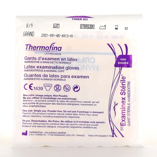 Les gants stériles en latex sont des gants d’examen en latex et non poudrés destinés à un usage unique. Pourquoi utiliser des gants stériles ? Nos mains sont de véritables vecteurs de transmission (virus, bactéries, etc.). En effet, elles transportent au quotidien des millions de bactéries et c’est ainsi que les maladies se transmettent. C’est pourquoi l’utilisation de gants stériles peut se révéler utile voire obligatoire dans certaines situations. Par exemple, l’usage de gants stériles peut être obligatoire pour les soins d’un patient, pour la désinfection de plaies, pour l’administration d’un traitement, pour la chirurgie, etc. Usage et caractéristiques des gants stériles en latex Thermofina Les gants d’examen stériles en latex sont réservés aux situations nécessitant des mesures d’ asepsie . Ces gants stériles non réutilisables sont reconnus comme des « dispositifs médicaux à usage invasif à court terme » : ils permettent de protéger le patient ainsi que le praticien de tout risque infectieux. Ils sont ambidextres et garantissent une liberté de mouvement et des gestes très précis. Les gants stériles en latex Thermofina ont été formulés à partir de caoutchouc naturel et d’additifs chimiques. La couleur de ces gants est crème, la manchette à bord roulé affiche une longueur de 240mm et leur surface est micro-texturée. Les gants d’examen stériles en latex sont disponibles en taille 8.5 sur la Pharmacie des Drakkars, ce qui équivaut à une taille L. Conditionnement proposé par votre pharmacie en ligne : 1 paire de gants d’examen stériles en latex. Avis du pharmacien sur Gants latex stériles Une fois l’utilisation de vos gants stériles terminez, suivant la procédure suivante pour enlever vos gants en toute sécurité : Prendre et pincer le gant au niveau de la manchette côté paume de la main. Enlever le gant en le retournant en un seul geste. Conserver le gant enlevé en boule dans l’autre main. Saisir le gant restant par la manchette et le retourner d’un seul geste. Jeter la paire de gants utilisée avant de se laver les mains à l’eau savonneuse. Précautions d’utilisation : Choisir une taille de gants adaptée pour plus de confort. Ne pas porter de bagues ni de faux-ongles pour éviter de craquer les gants. Portez des gants stériles sur des mains propres et sèches. Changer régulièrement de gants, environ toutes les 20 minutes. Enfiler les gants de manière délicate. Marque Thermofina Référence(s) 2000090021099 Partie du corps Mains Pour qui ? Hommes – Femmes Mis à jour le : 16/07/2025